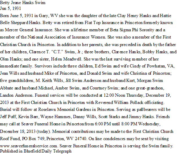 Notes for BETTY JEANE HANKS SWIM: