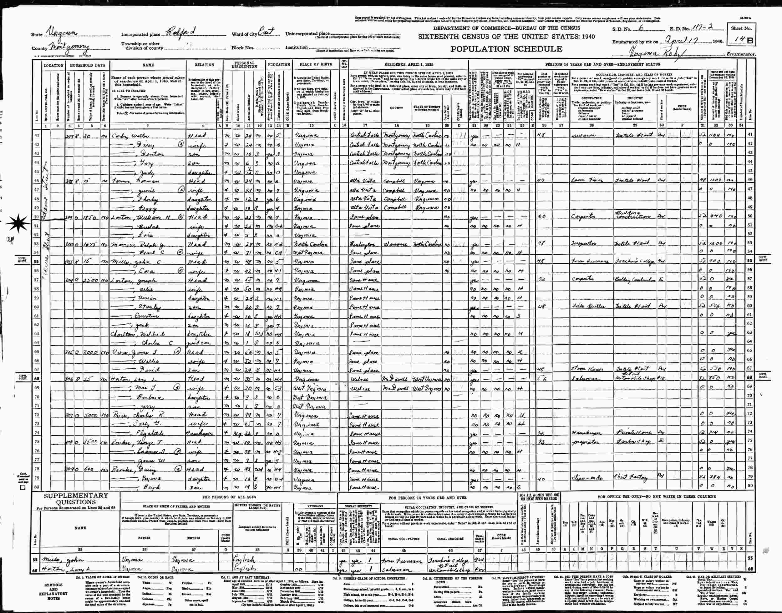 April 17, 1940 - Adams Street, East Ward, Supervisor's District 6, Enumeration District 117-2, Radford, Montgomery County, Virginia.