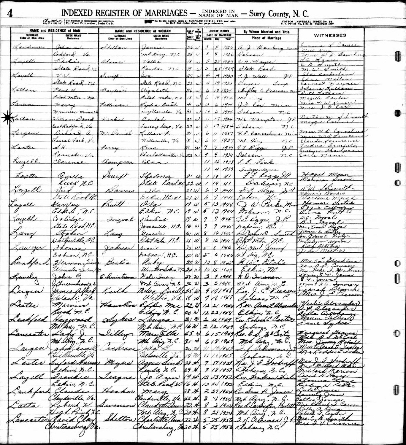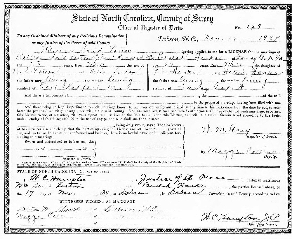 Married: William David Larton, Jr. November 17, 1934 in Dobson, Surry County, North Carolina.