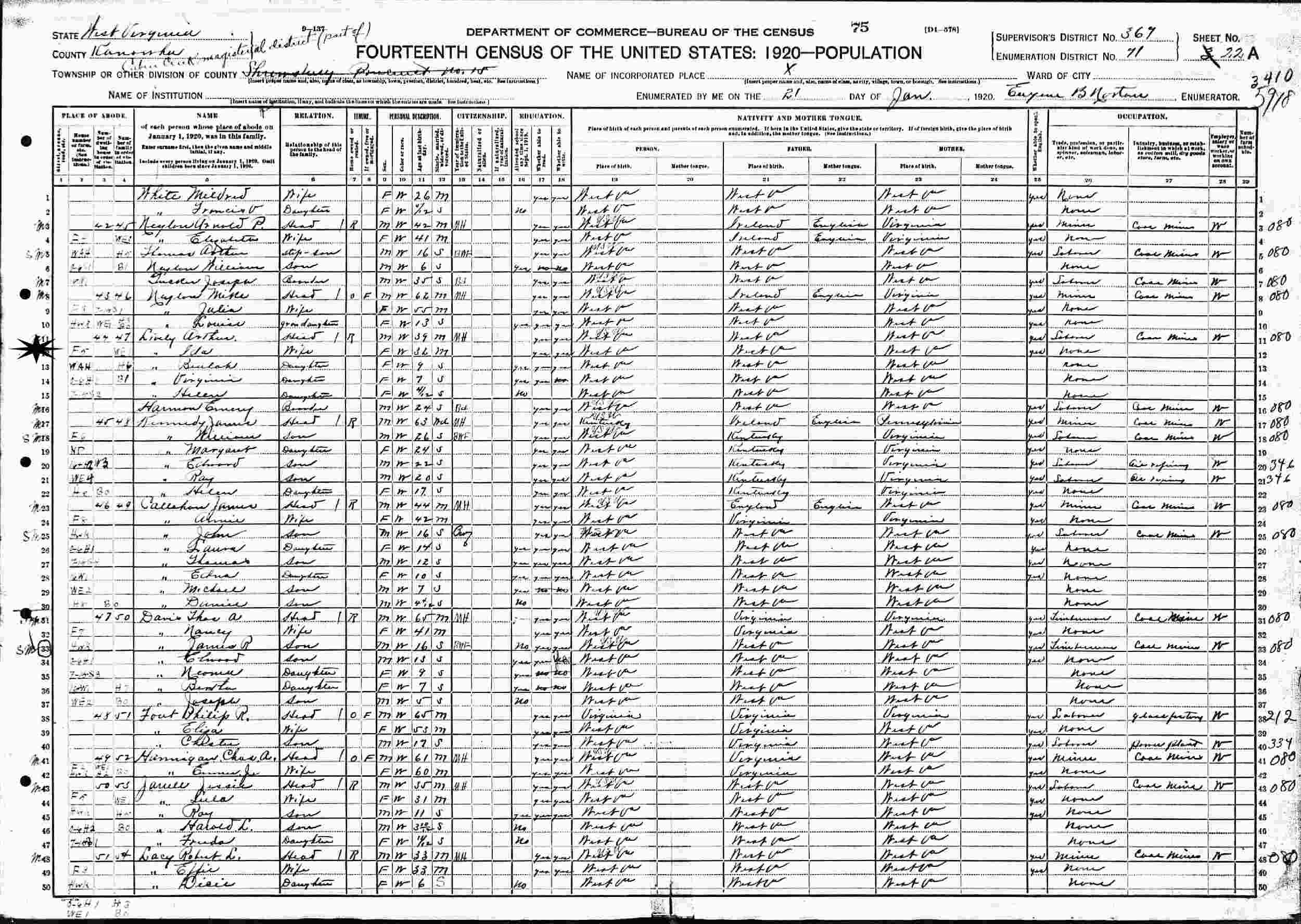 January 21, 1920 - Supervisor's District 367, Enumeration District 71, Cabin Creek Magisterial District, Kanawha County, West Virginia.