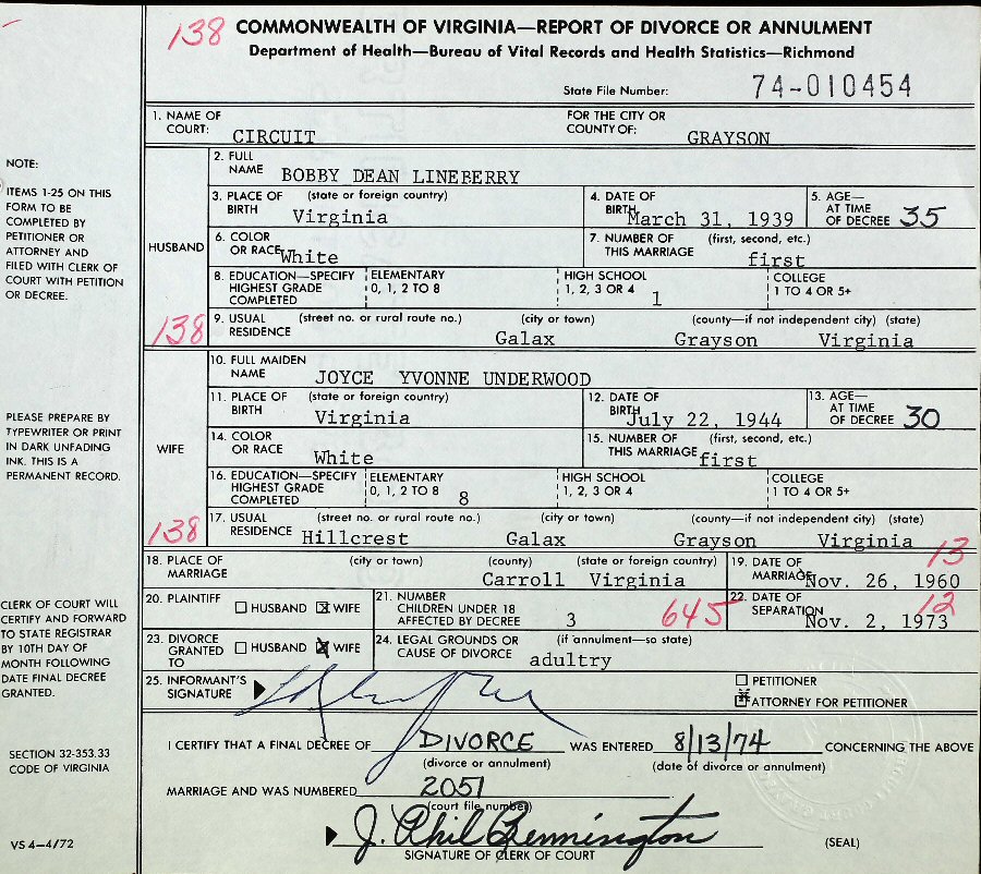 Married: (1) Joyce Yvonne Underwood November 26, 1960 in Carroll County, Virginia. (Separation: November 2, 1973; Divorce: August 12, 1974. 3 Children.)