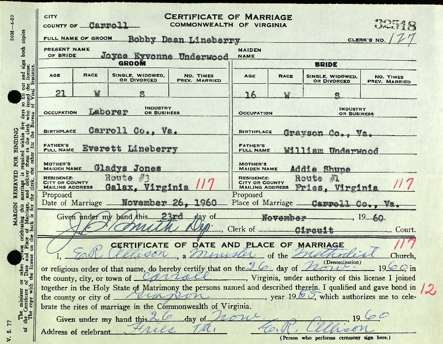 (2) Hessie Mae Frost September 26, 1975 in Galax, Virginia. (She married (1) Leon Ralph Summers October 8, 1968; Separation: November 2, 1973; Divorce: June 7, 1975, Grayson County, Virginia.)