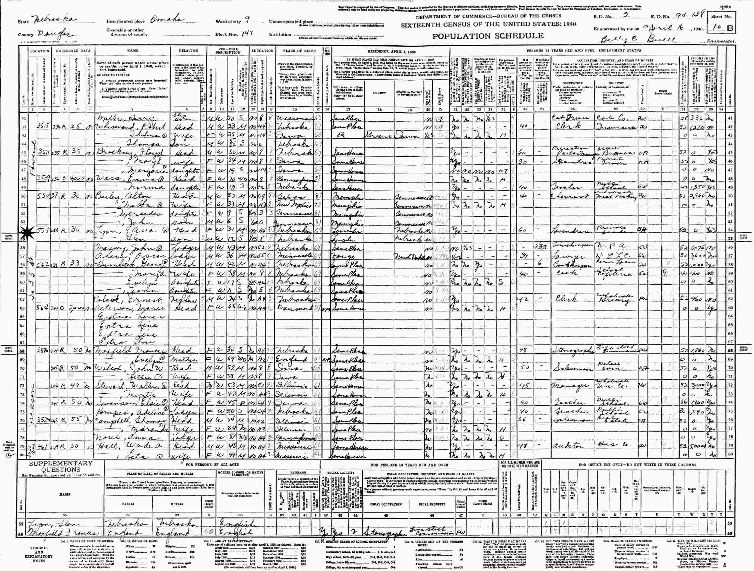 April 16, 1940 - 558 S 35th Street, Ward 9, Block 147, Supervisor's District 2, Enumeration District 94-138, Omaha, Douglas County, Nebraska.