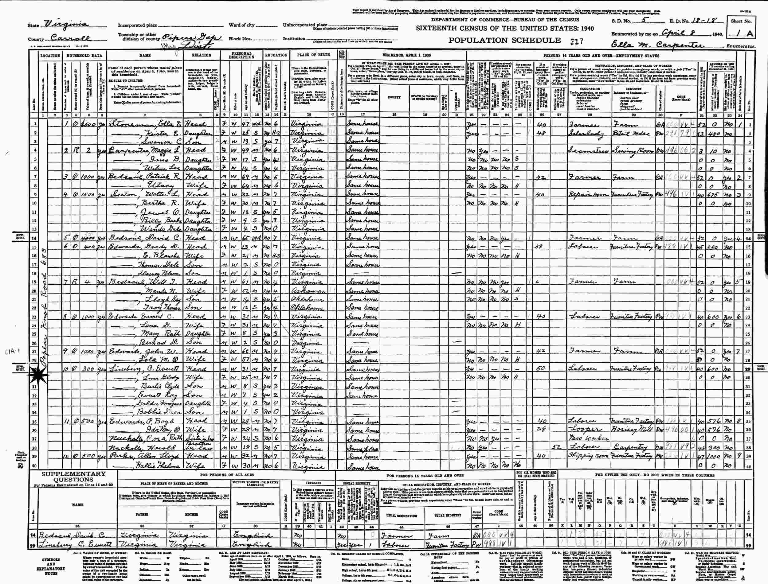 April 8, 1940 - Poplar Knob Road, Pipers Gap Magisterial District, Supervisor's District 5, Enumeration District 18-18, Carroll County, Virginia.