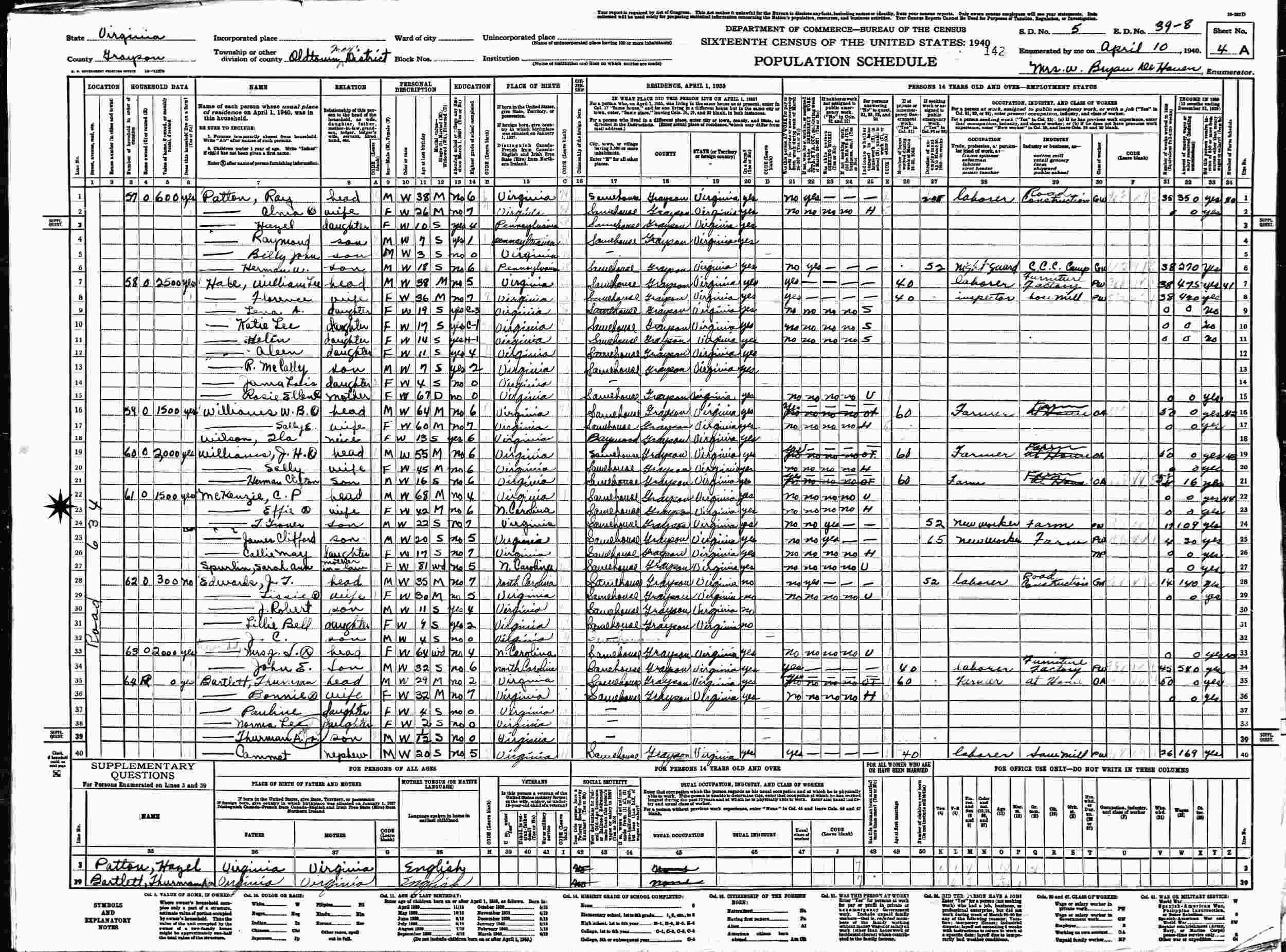 April 8, 1930 - Supervisor's District 8, Enumeration District 39-5, Oldtown Magisterial District, Grayson County, Virginia.