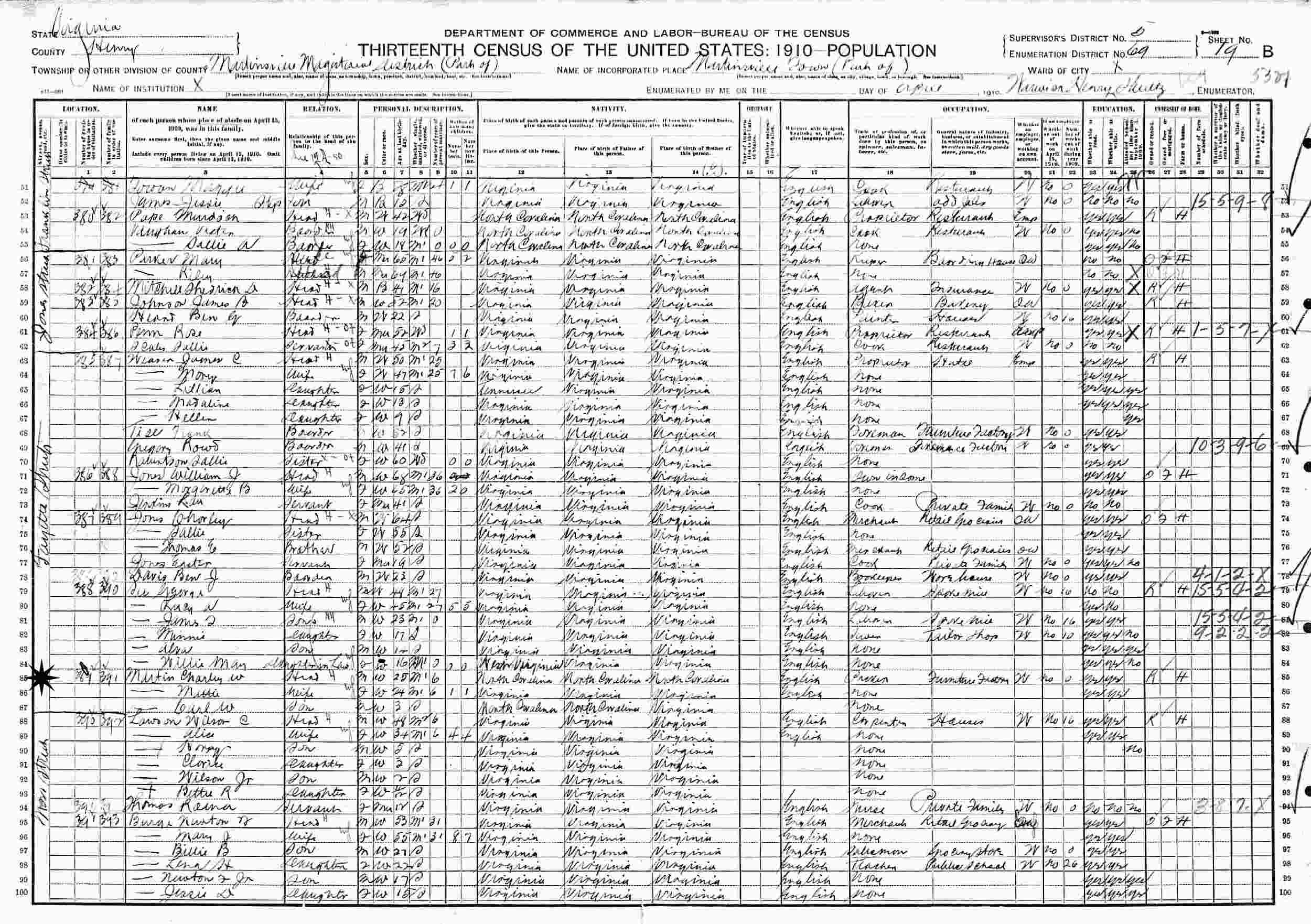 April, 1910 - Fayette Street, Supervisor's District 5, Enumeration District 69, Martinsville Town, Henry County, Virginia.