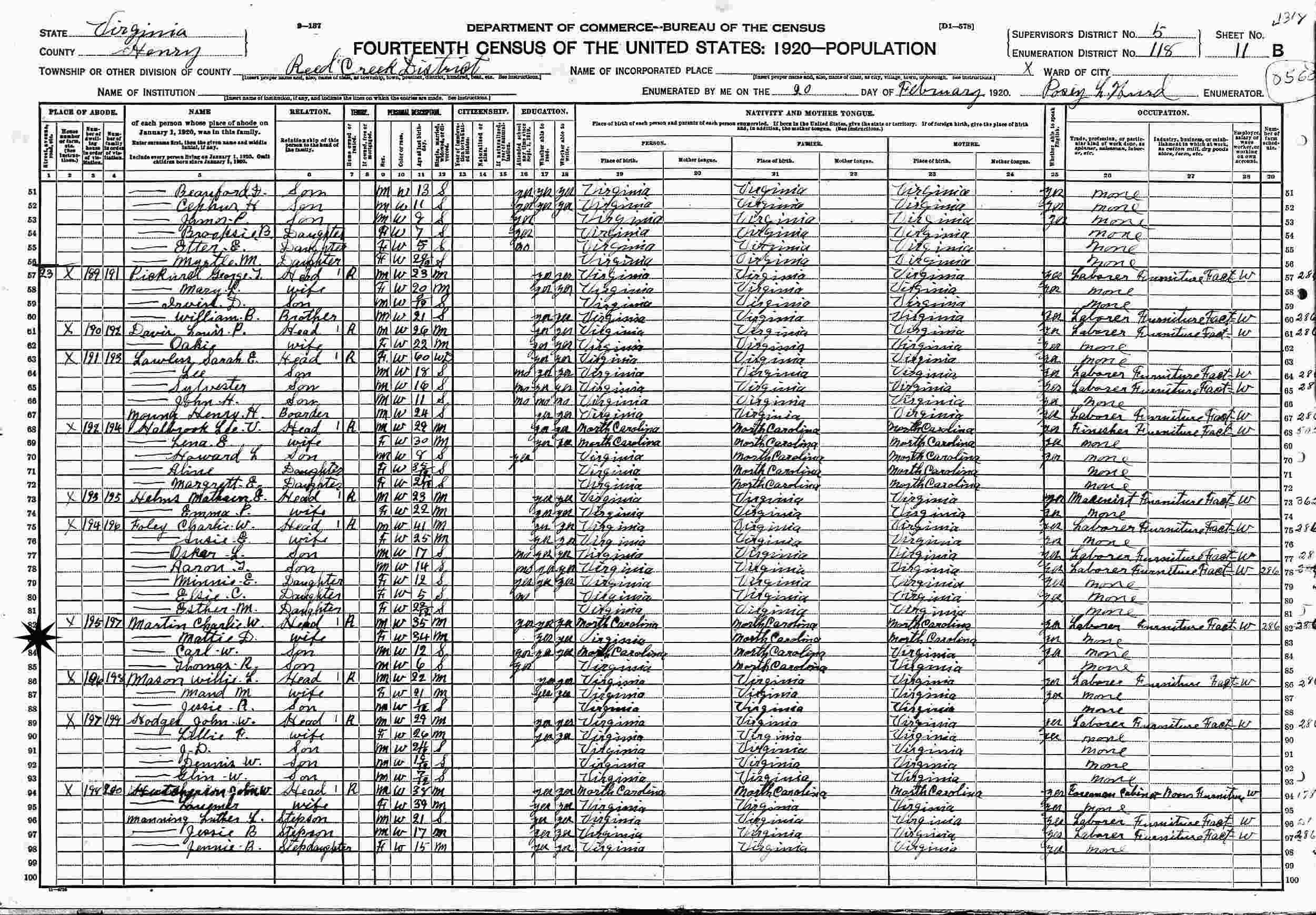 February 20, 1920 - Supervisor's District 5, Enumeration District 118, Red Creek District, Henry County, Virginia.