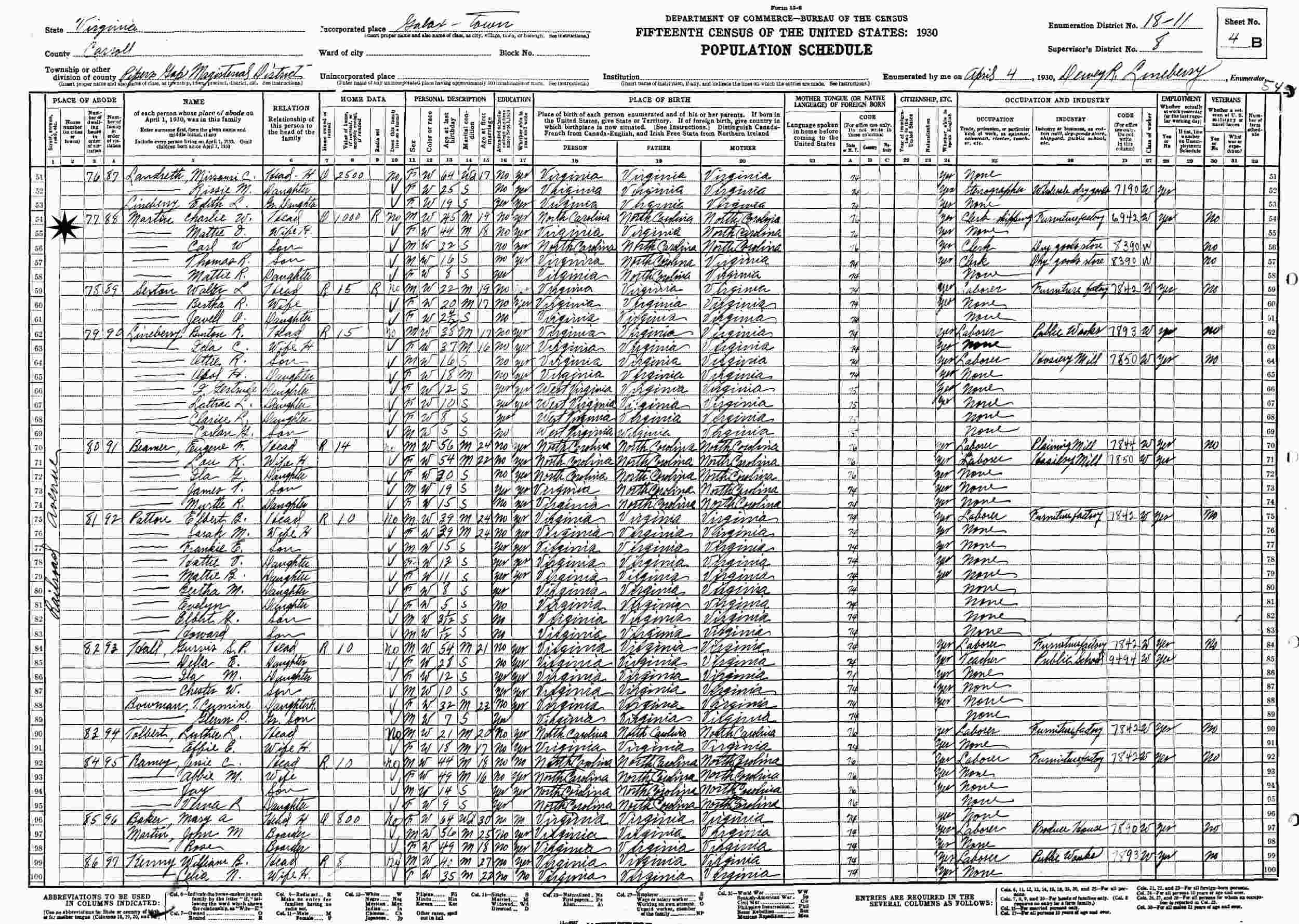 April 4, 1930 - Railroad Avenue, Supervisor's District 8, Enumeration District 18-11, Pipers Gap Magisterial District, Galax Town, Carroll County, Virginia.