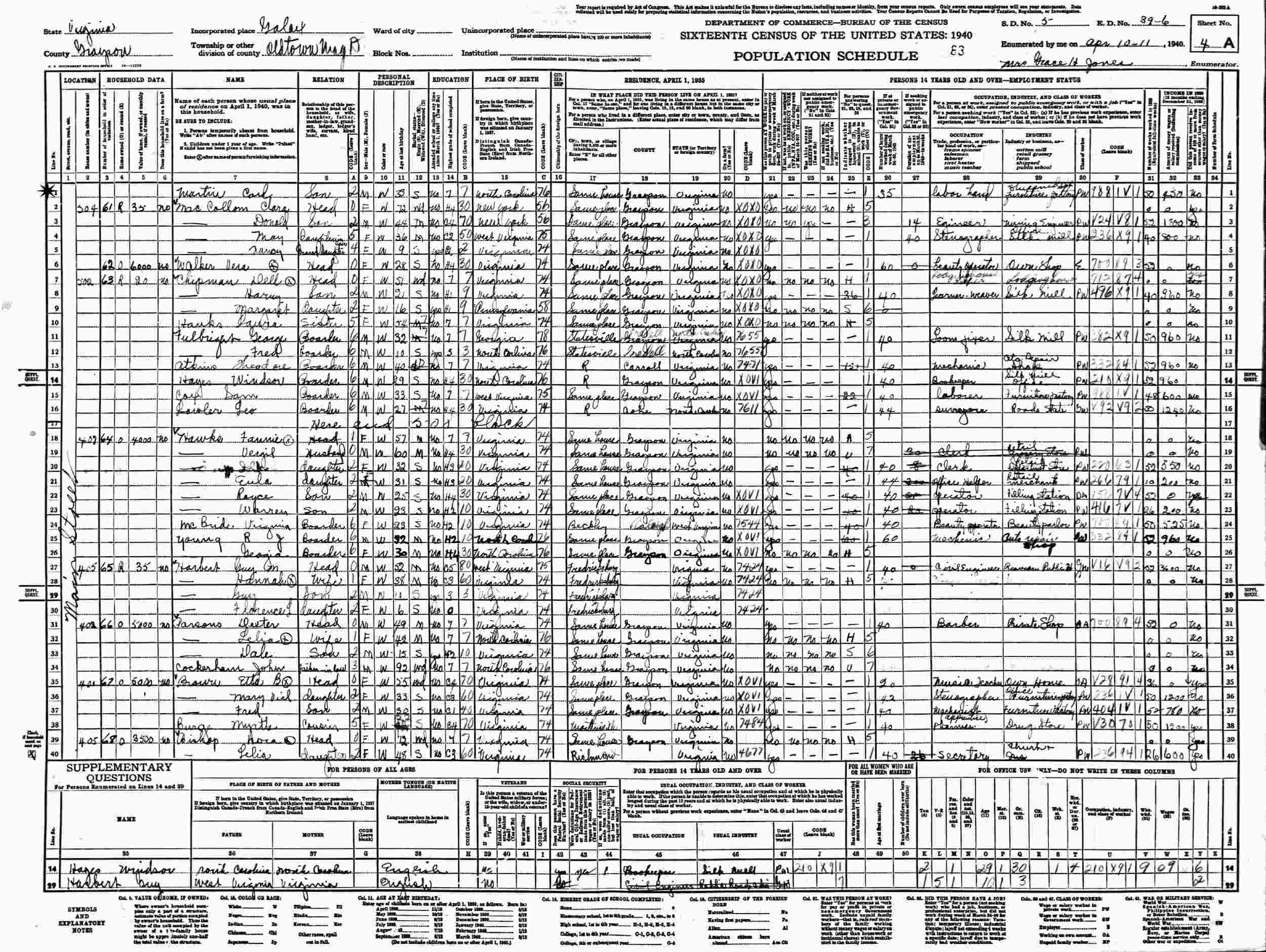 April 8, 1940 - 508 Main Street, Supervisor's District 5, Enumeration District 39-6, Oldtown, Galax, Grayson County, Virginia.