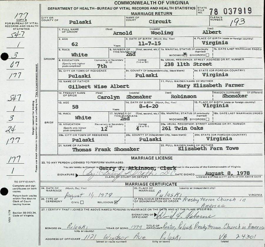 (2) Arnold Wooling/Wolling Albert August 11, 1978 in Pulaski, Pulaski County, Virginia. (Separation: April 20, 1979; Divorce: June 18, 1980, Pulaski, Pulaski County, Virginia) (Son of Gilbert Wise and Mary Elizabeth (Farmer) Albert. b. November 7, 1915, Virginia; d. October 1 1994, Pulaski County, Virginia.)