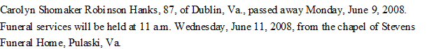Died: June 9, 2008 in Dublin, Pulaski County, Virginia.