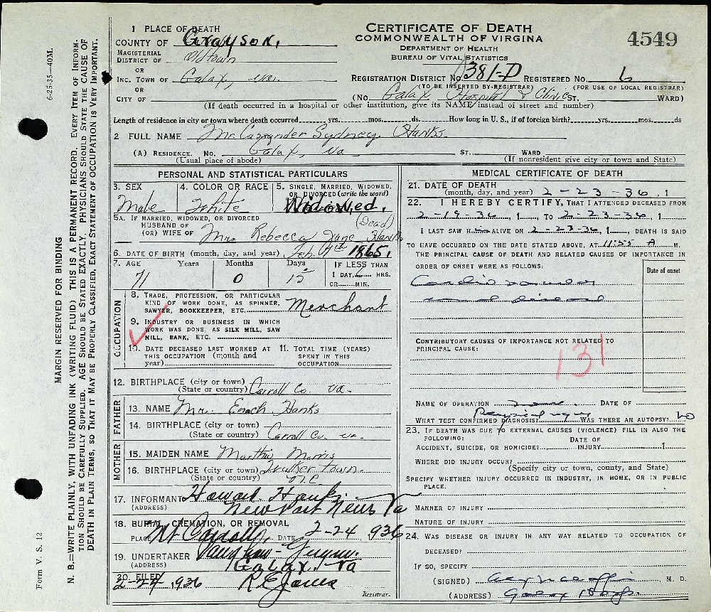 Died: February 23, 1936 in Galax, Grayson County, Virginia.