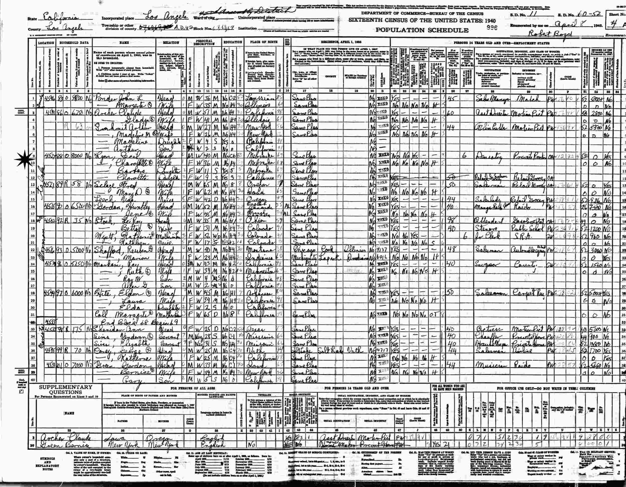 April 8, 1940 - 4527 Talofa, Assembly District 42, Blocks 67-69, Supervisor's District 11, Enumeration District 60-52, Los Angeles, Los Angeles County, California.