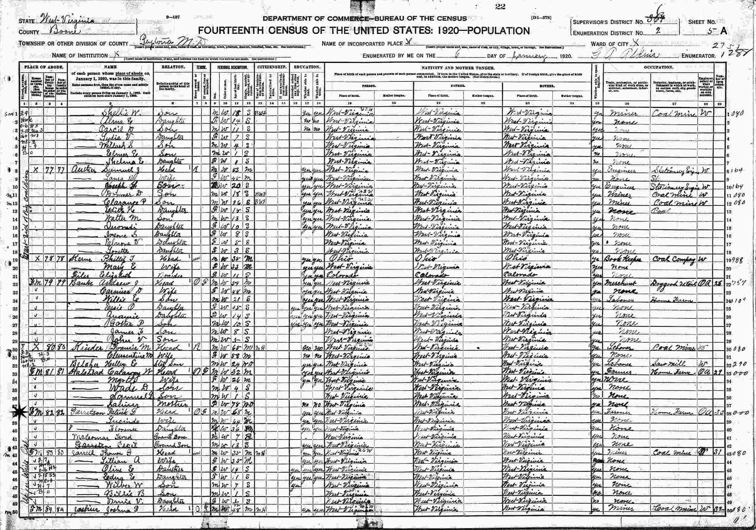 January 6, 1920 - Upper White Oak, Supervisor's District 367 (crossed out to 6), Enumeration District 2, Peytona Magisterial District, Boone County, West Virginia (w/paternal grandparents).