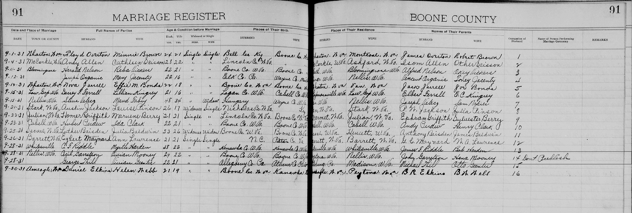 Married: Vivian B Mooney September 28, 1931 in Nellis, Boone County, West Virginia.