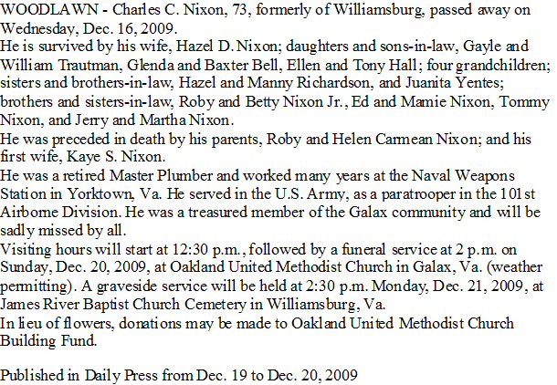 Son of Roby Jefferson and Helene Marie (Carmean) Nixon.