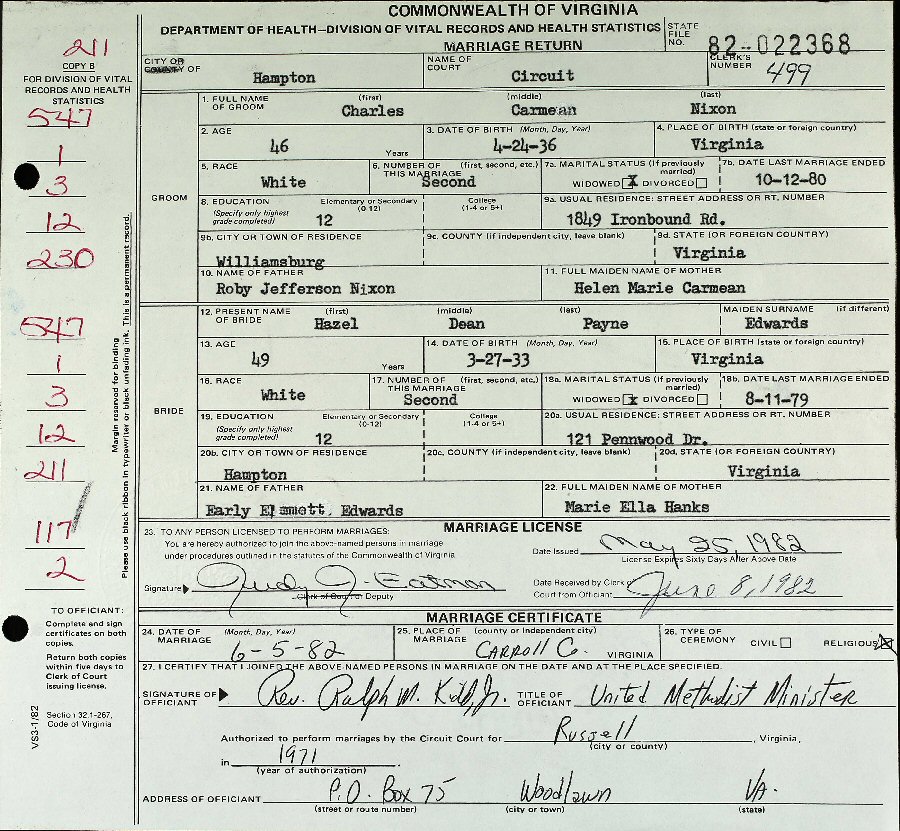 (2) Hazel Dean (nee Edwards) Payne June 5, 1982 in Carroll County, Virginia.