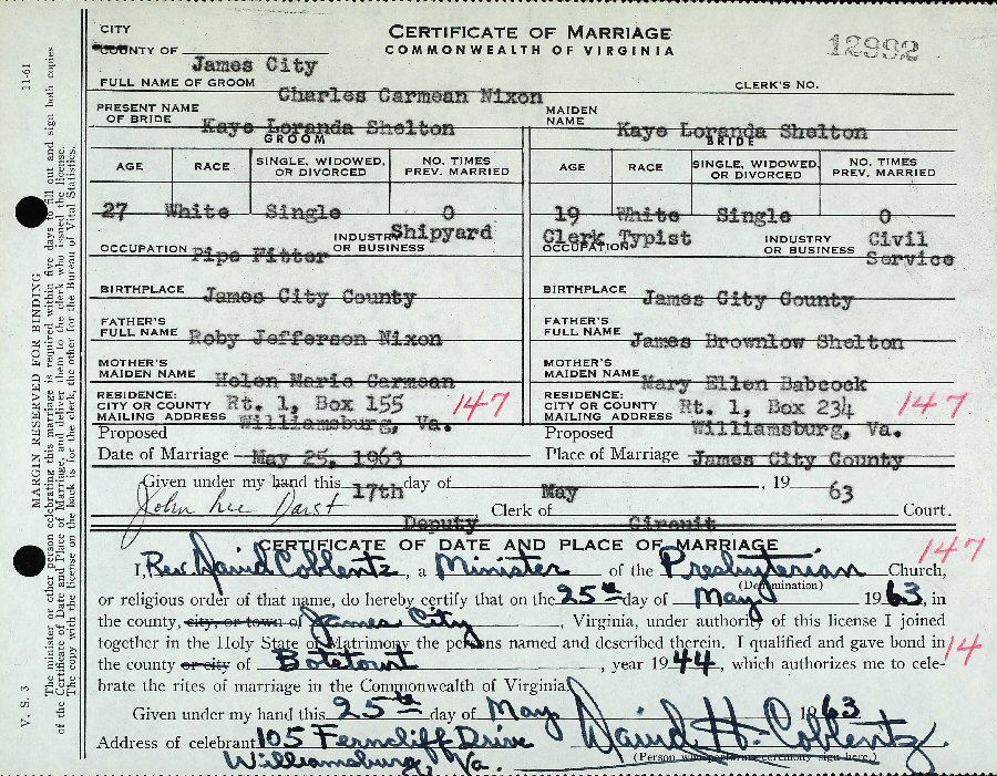 Married: (1) Kaye Loranda Shelton May 25, 1963 in James, Virginia. (b. July 3, 1943, James, Virginia; d. October 12, 1980, Unknown.)
