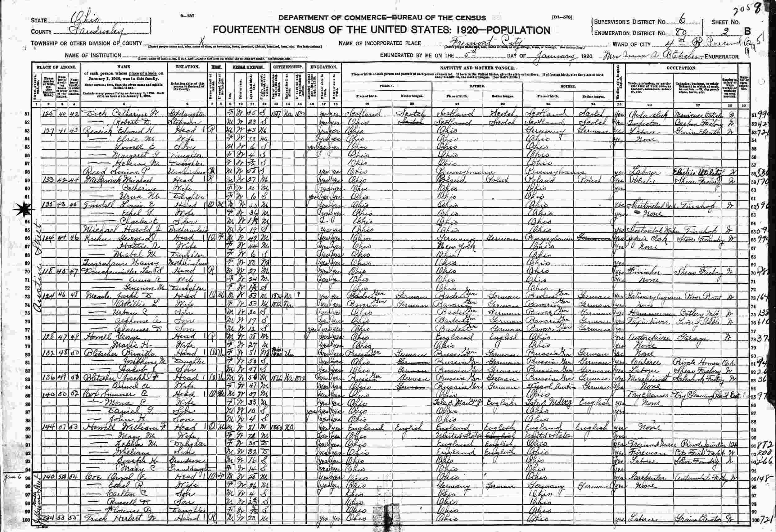 January 5, 1920 - 135 Austin Street, Precinct B, Ward 4, Supervisor's District 6, Enumeration District 80, Fremont, Sandusky County, Ohio.