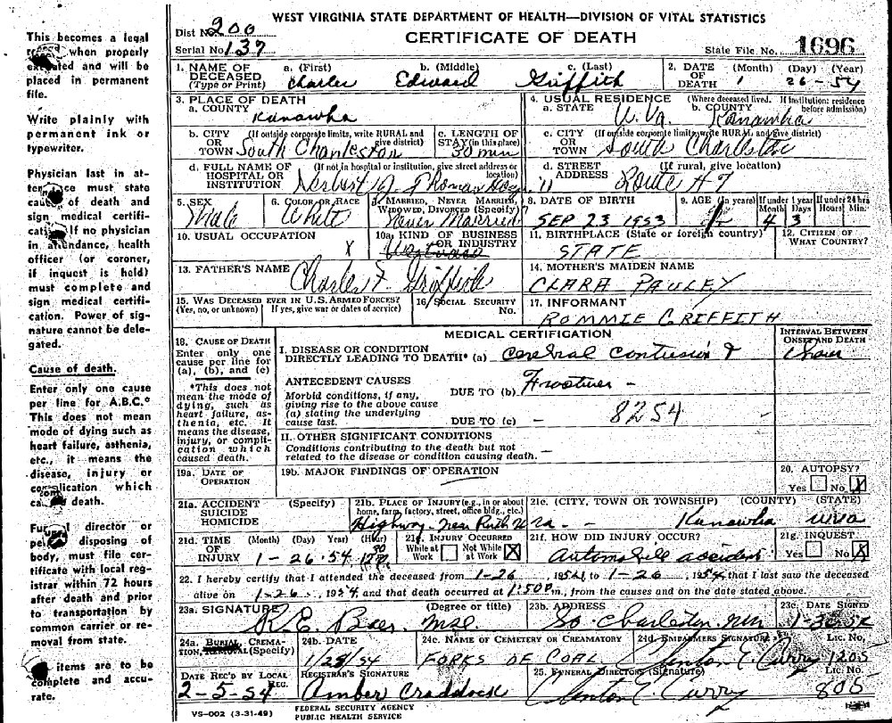 Died: January 26, 1954 in Charleston, Kanawha County, West Virginia.