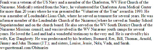 Notes for CHARLES FRANKLIN "FRANK" DAUGHTERY: