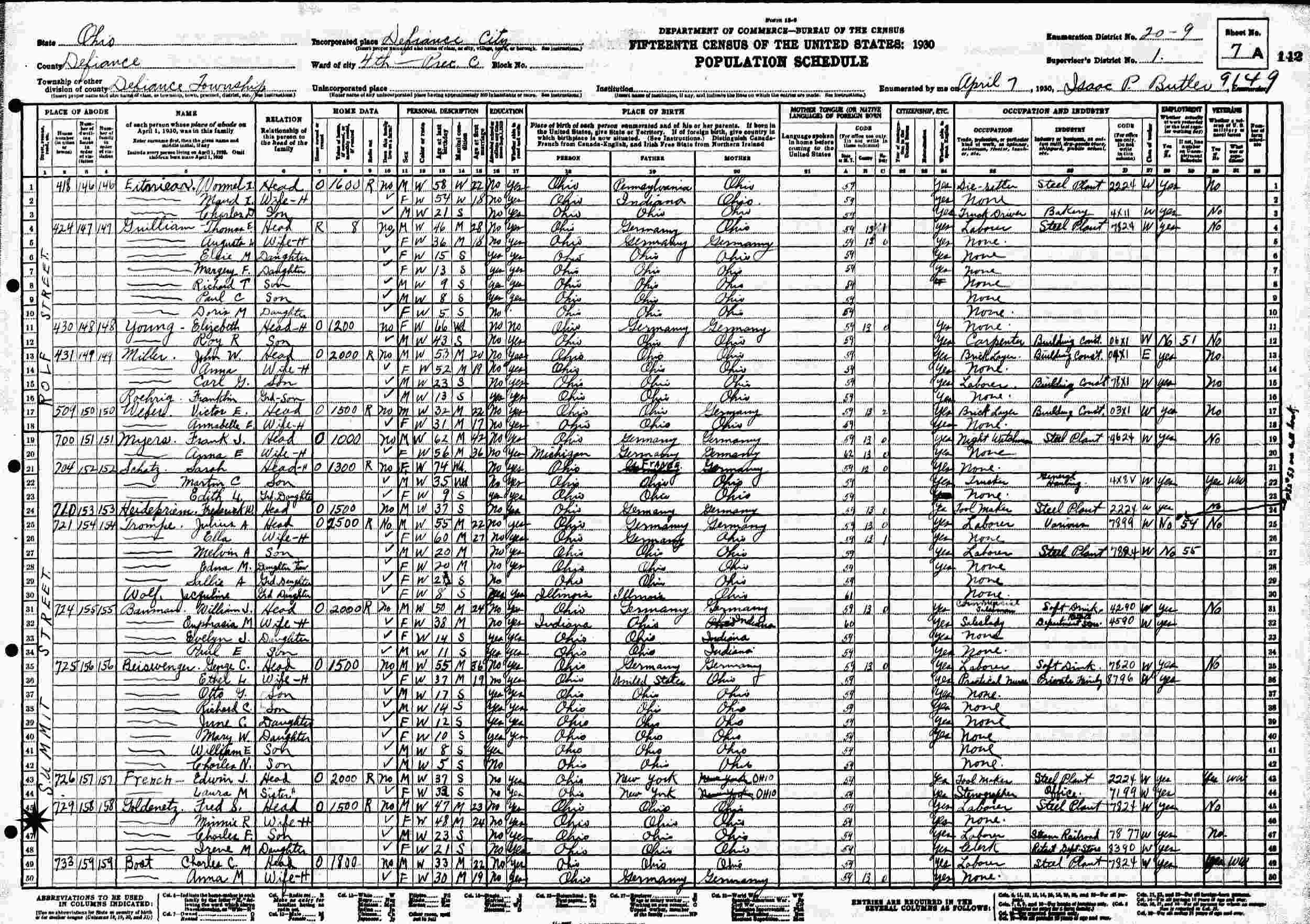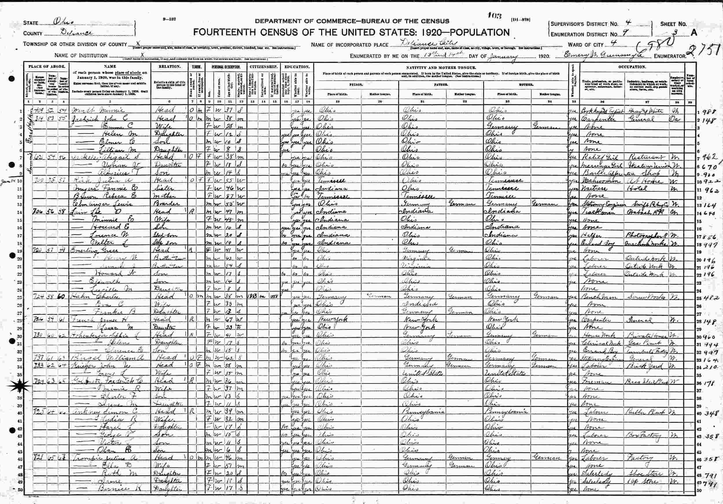 January 12-13, 1920 - 729 Summit Street, Ward 4, Supervisor's District 4, Enumeration District 9, Defiance, Defiance County, Ohio.