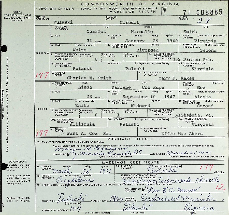 (2) Linda Darlene (nee Cox) Rupe March 25, 1971 in Pulaski, Pulaski County, Virginia.