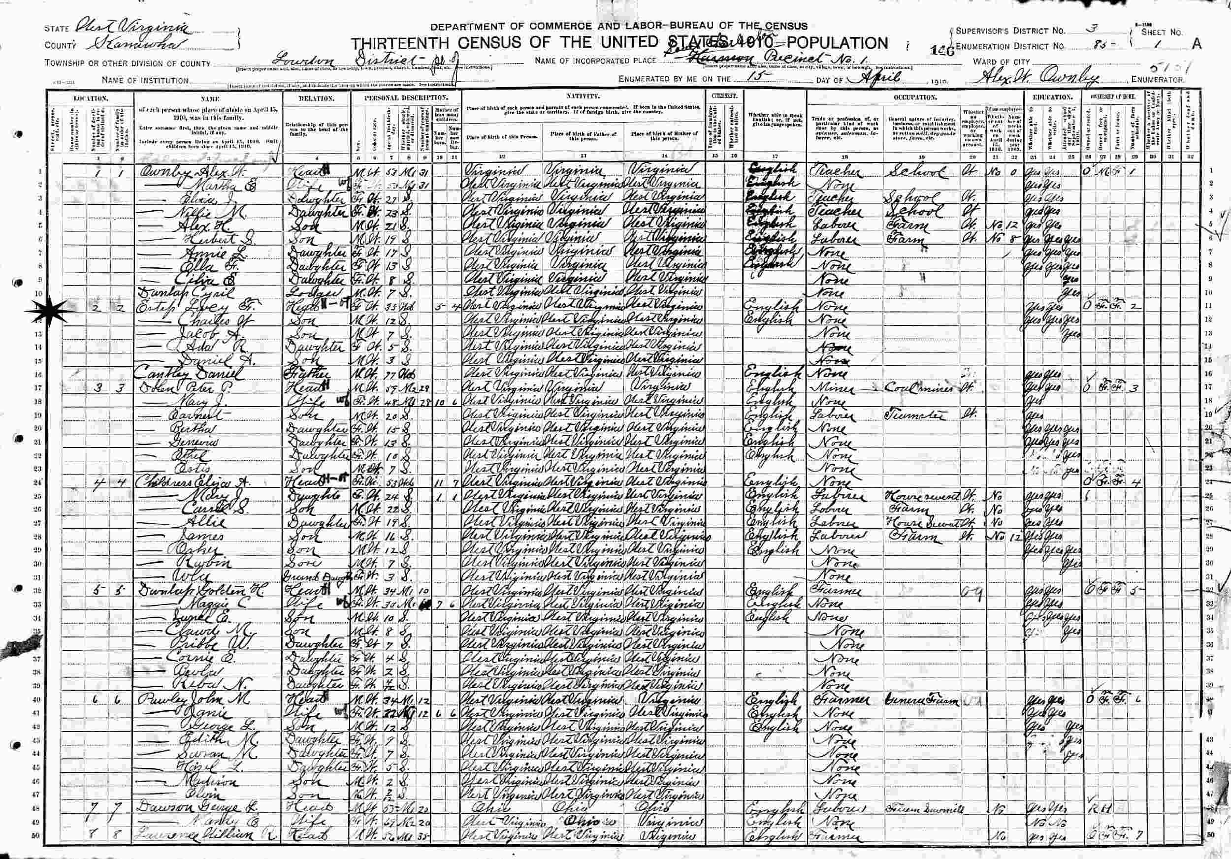 April 15, 1910 - Precinct 1, Supervisor's District 3, Enumeration District 85, Loudon District, Kanawha County, West Virginia.