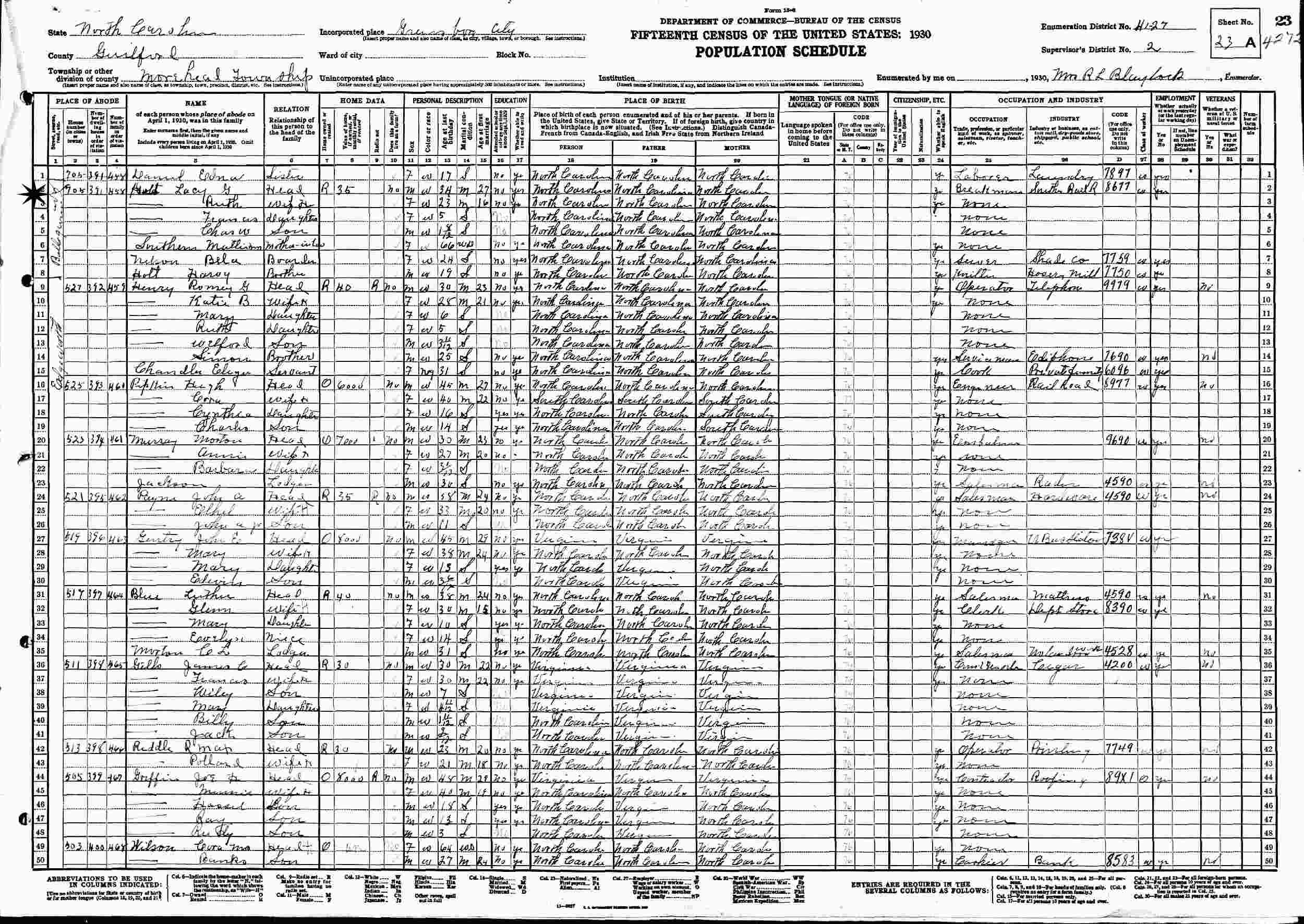 1930 - Balleground Avenue, Supervisor's District 2, Enumeration District 41-27, Morehead Township, Greensboro, Guilford County, North Carolina.