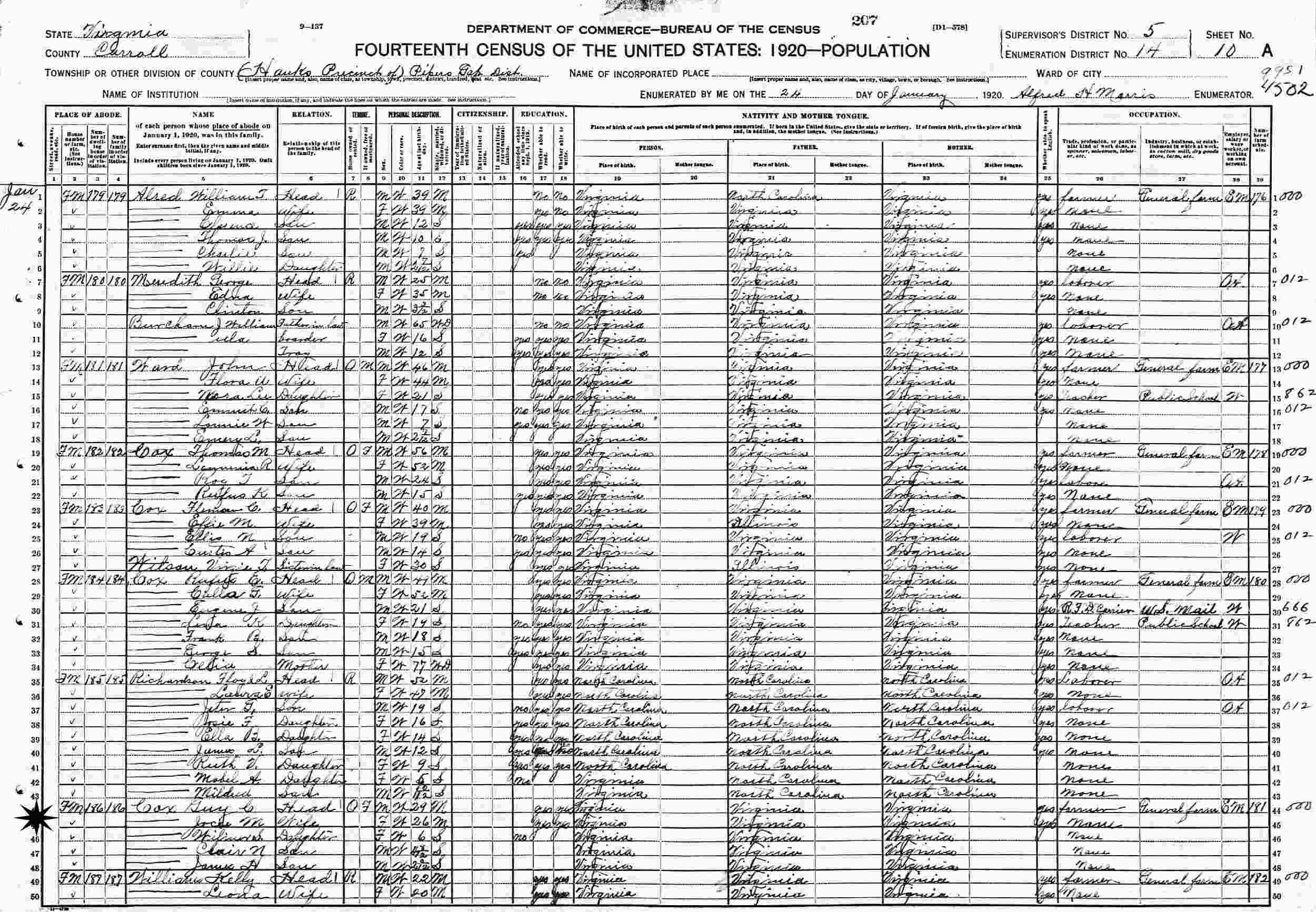 January 24, 1920 - Hanks Precinct, Supervisor's District 5, Enumeration District 14, Pipers Gap Magisterial District, Carroll County, Virginia.