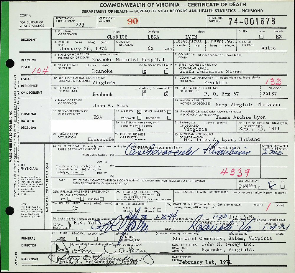 Died: January 26, 1974 in Roanoke City, Virginia.