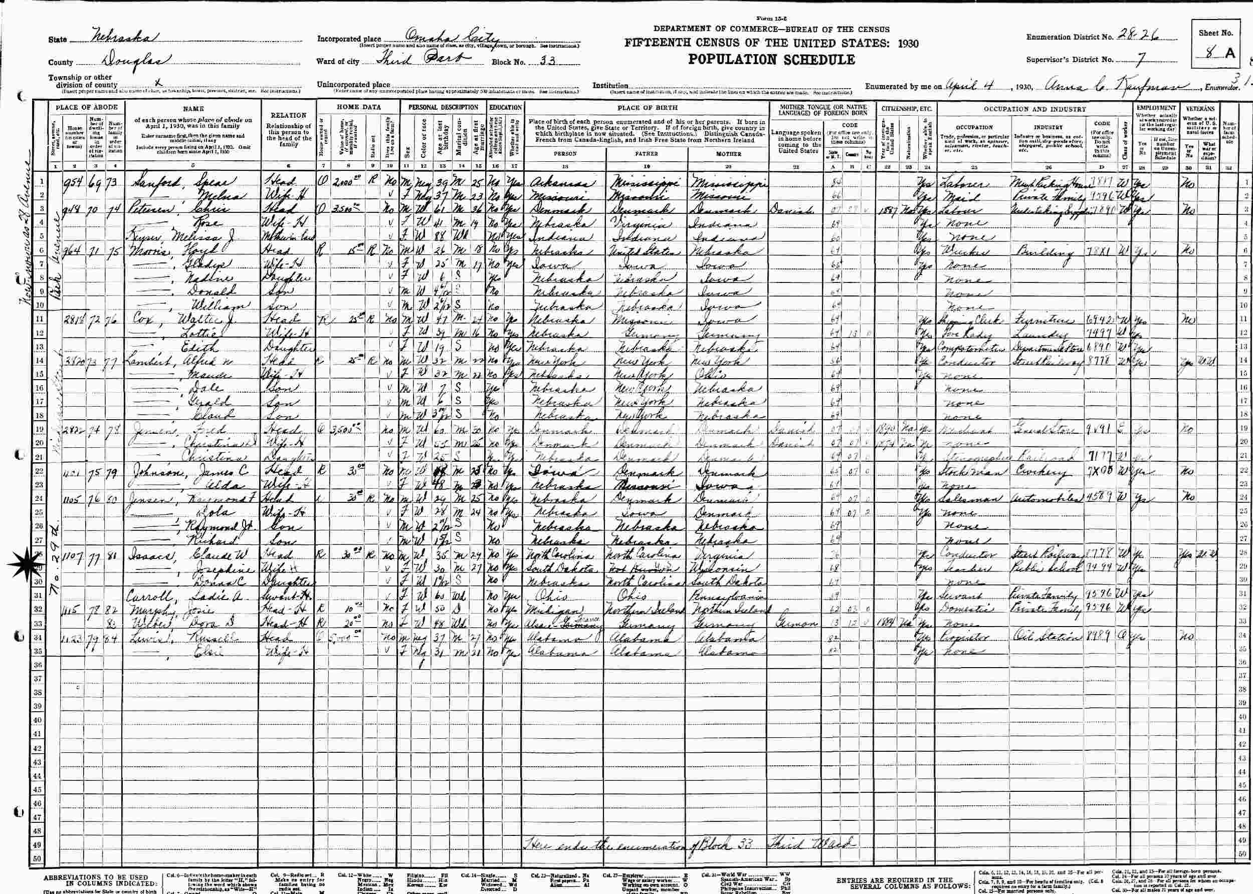 April 4, 1930 - Ward 3, Block 33, Supervisor's District 7, Enumeration District 28-26, Omaha, Douglas County, Nebraska.