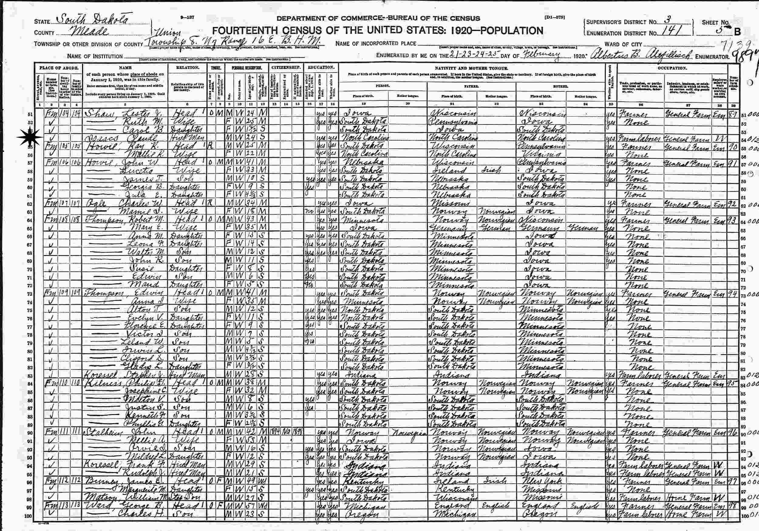 February 21-25, 1920 - Union Township 8 N or Range 16 E B.H.M., Supervisor's District 3, Enumeration District 131, Meade County, South Dakota.
