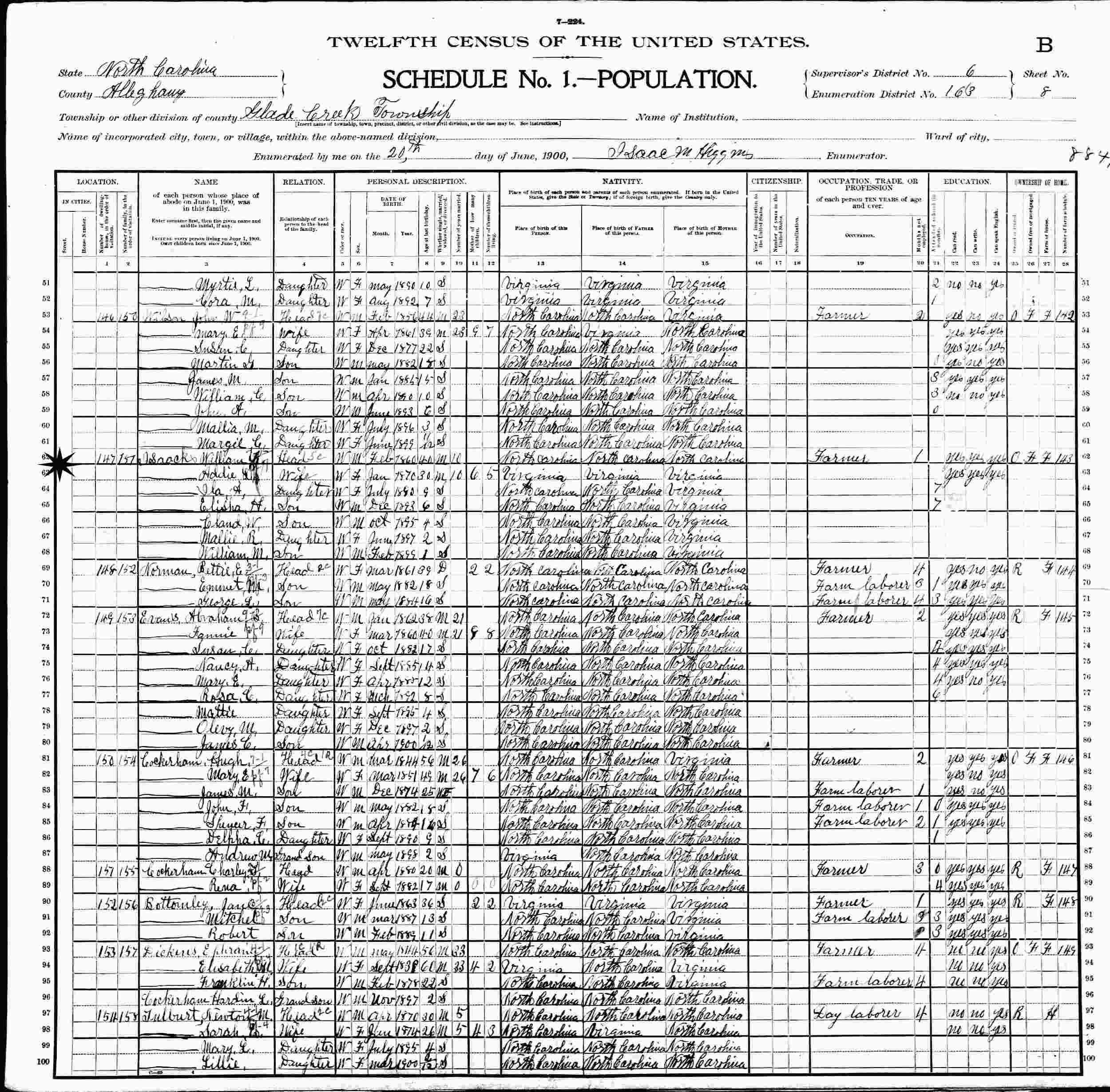 June 20, 1900 - Glade Creek Township, Supervisor's District 6, Enumeration District 163, Alleghany County, North Carolina.