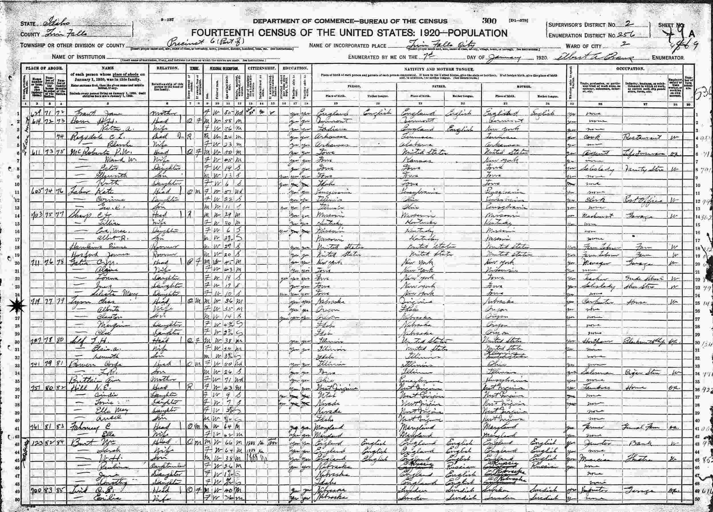January 7, 1920 - 719 2nd Avenue, Ward 2, Precinct 6, Supervisor's District 2, Enumeration District 256, Twin Falls, Twin Falls County, Idaho.