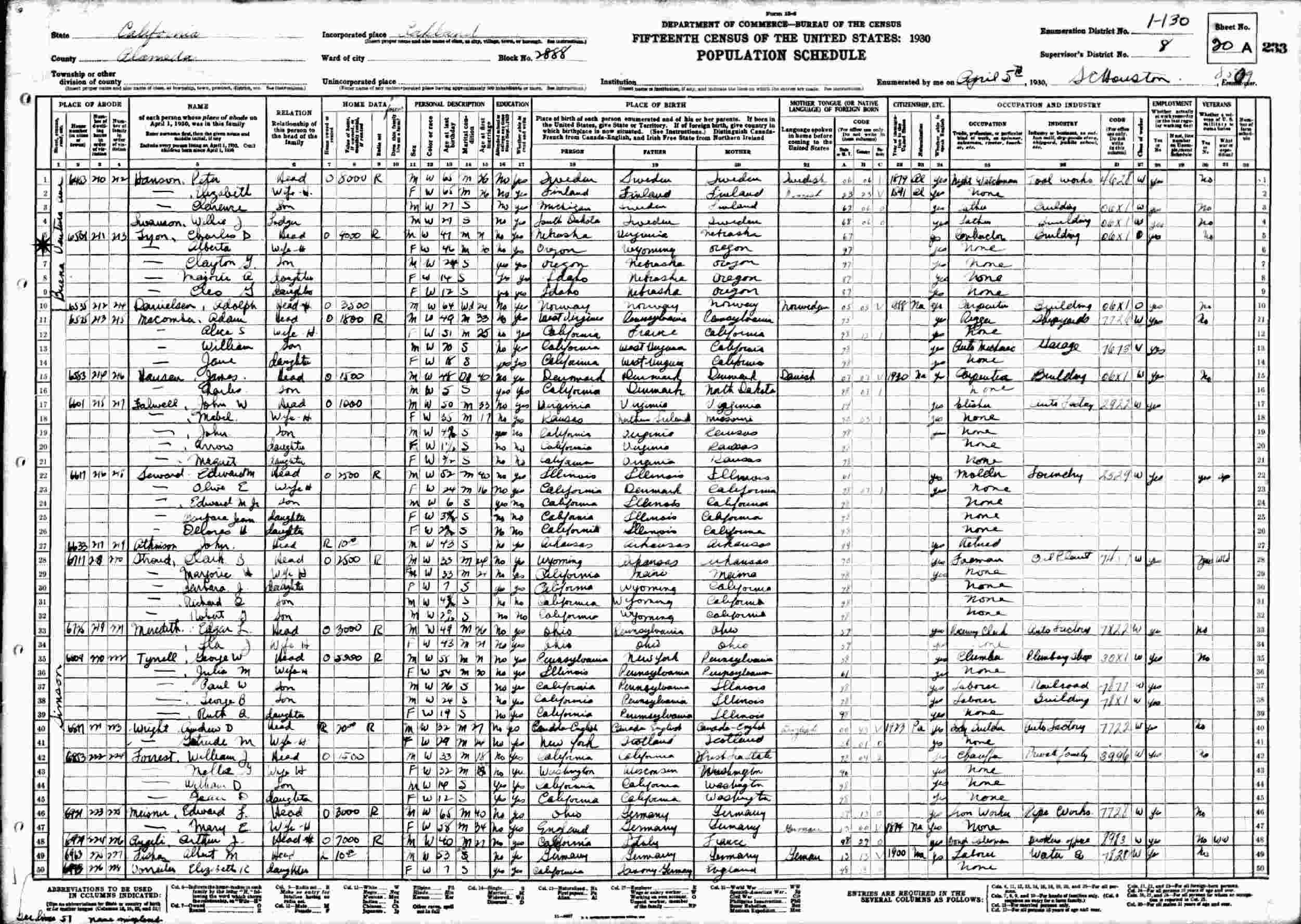 April 5, 1930 - 6501 Buena Ventura Avenue, Block 2888, Supervisor's District 8, Enumeration District 1-130, Oakland, Alameda County, California.