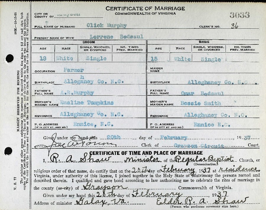 Married: (1) Laurene Martha Bedsaul February 20, 1937 in Grayson County, Virginia.