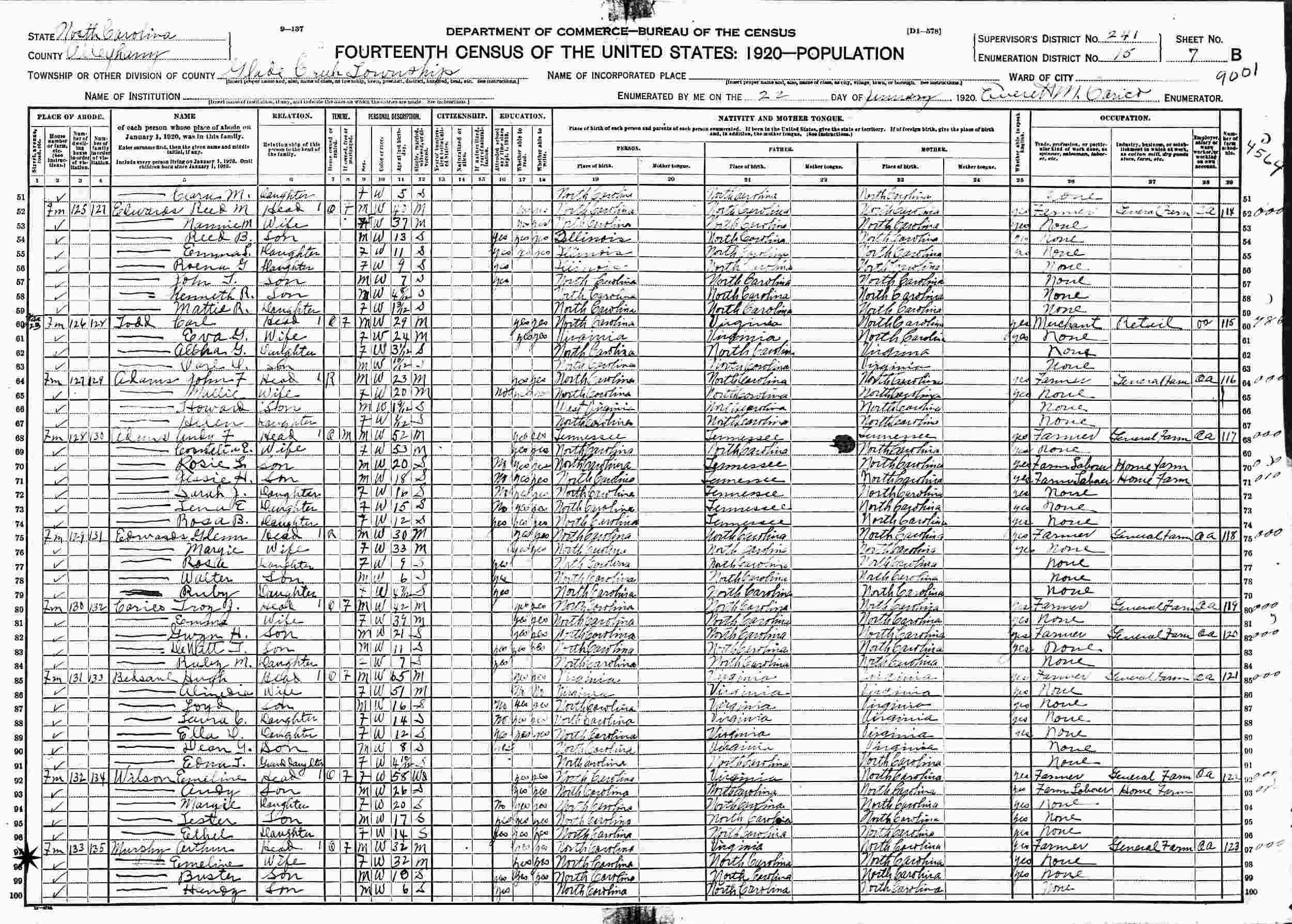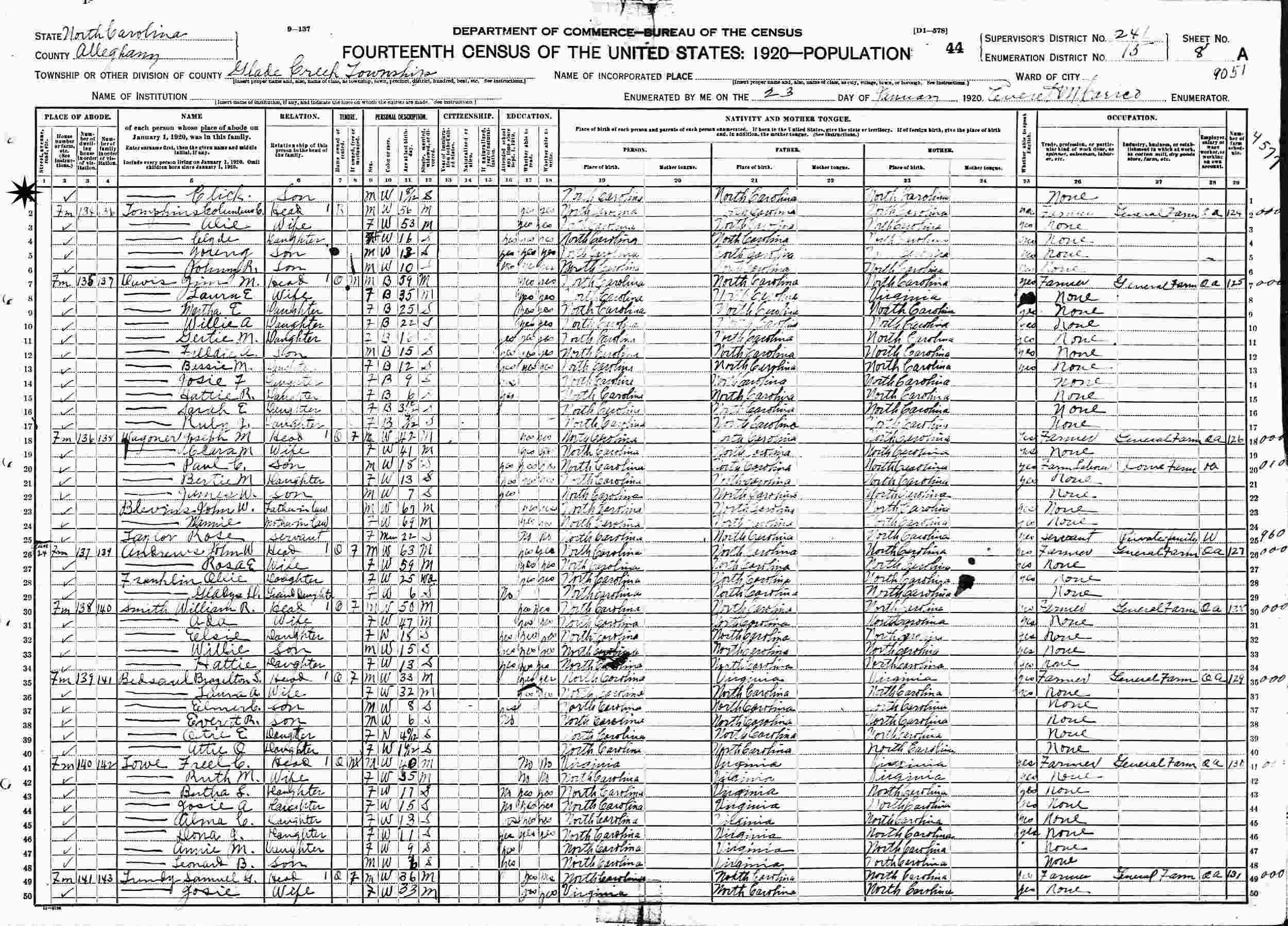 January 22, 1920 - Glade Creek Township, Supervisor's District 241, Enumeration District 15, Alleghany County, North Carolina.