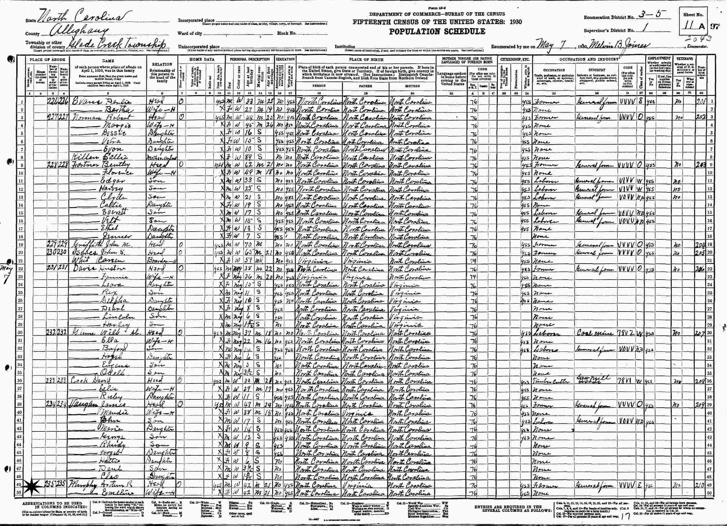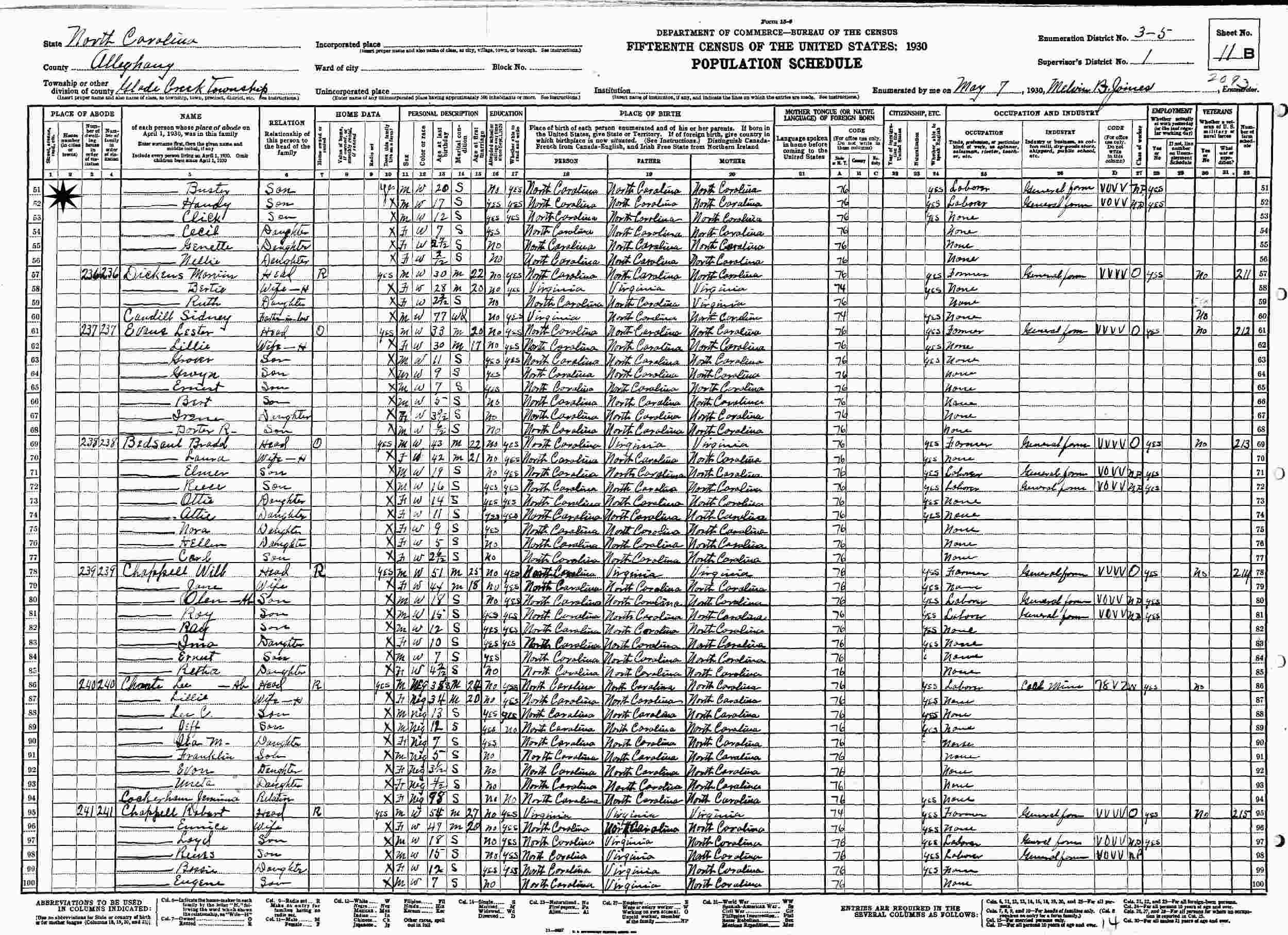 May 7 1930 - Glade Creek Township, Supervisor's District 1, Enumeration District 3-5, Alleghany County, North Carolina.