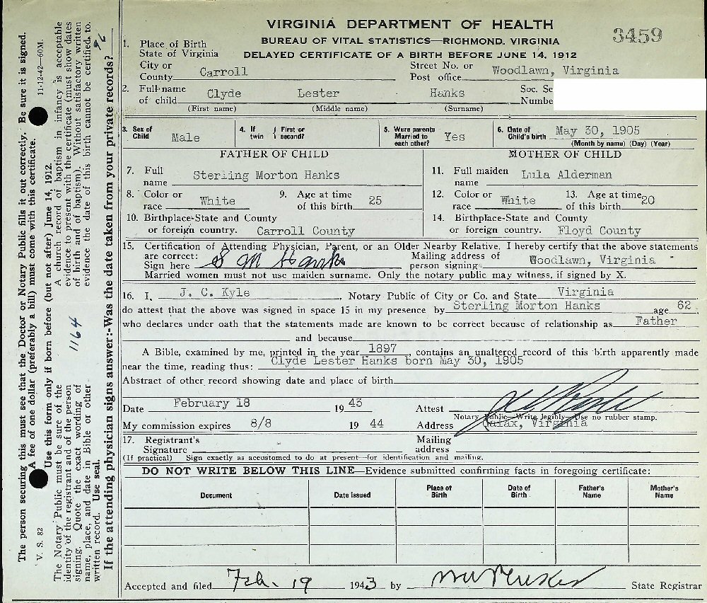 Born: May 30, 1905 in Woodlawn, Carroll County, Virginia.