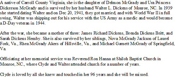 Married: Walter Lawrence Dickens December 20, 1944 in Hillsville, Carroll County, Virginia.