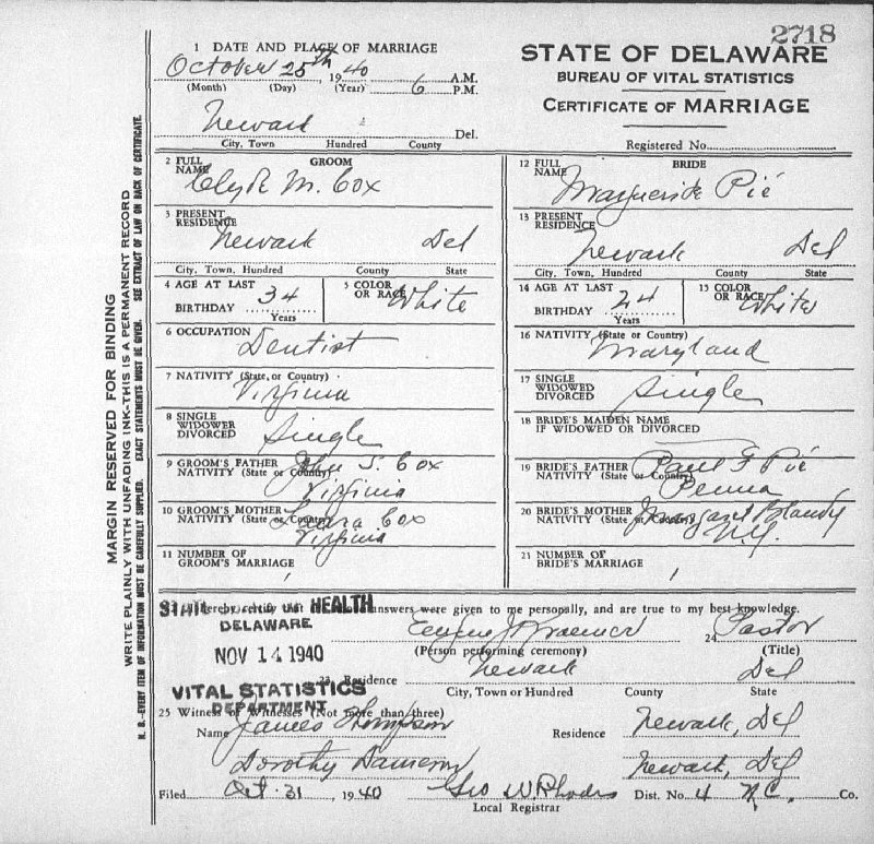 Married: Marguerite "Mimi" Pie October 25, 1940 in Newark, New Castle County, Delaware.