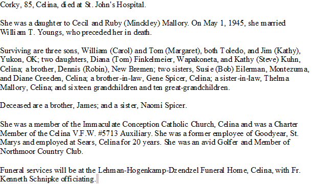 Notes for CORINNE ARLENE "CORKY" MALLORY YOUNGS: