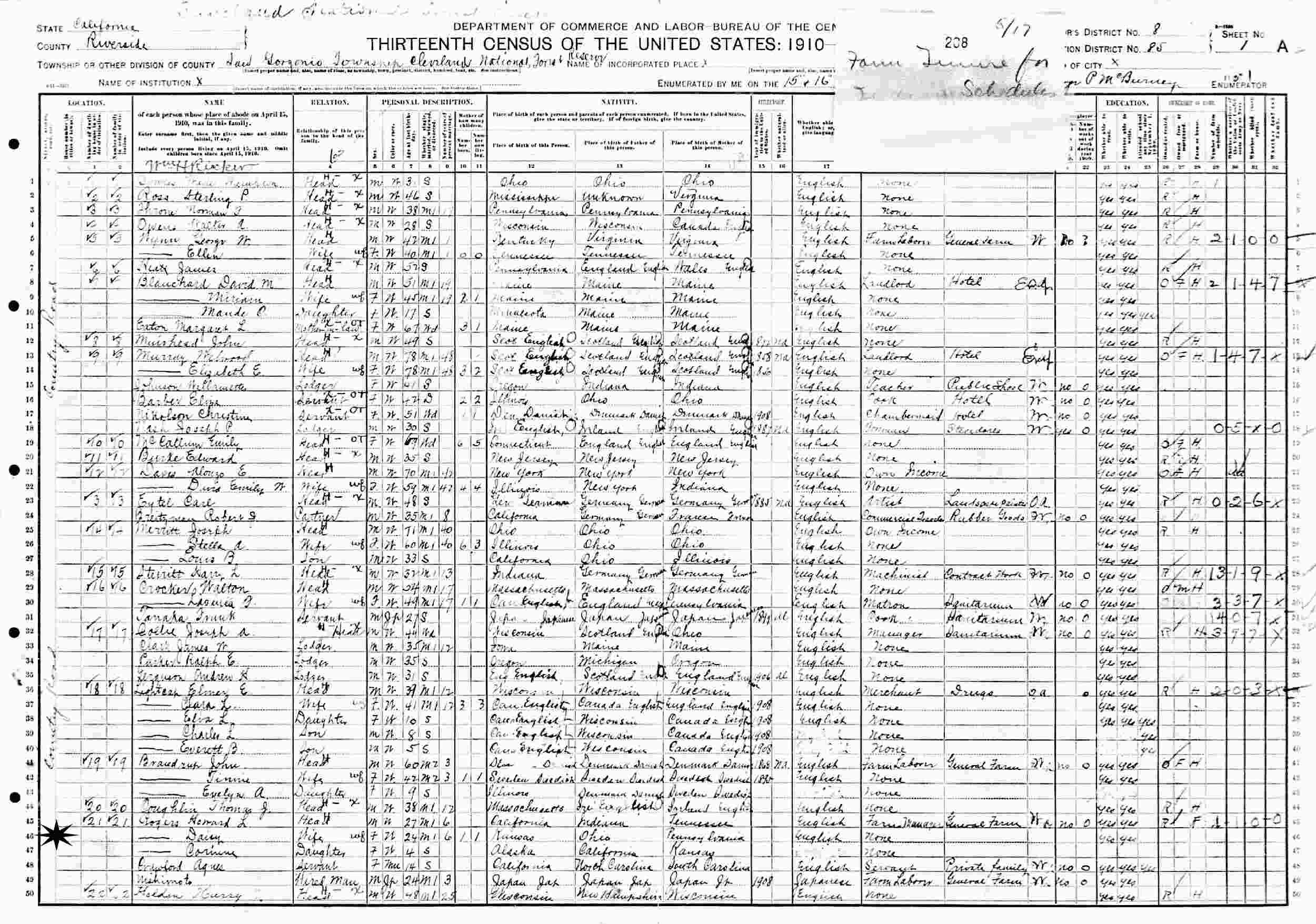 May 15-17, 1910 - County Road, Supervisor's District 7, Enumeration District 85, San Gorgonio Township, Cleveland National Forest Reserve, Riverside County, California.