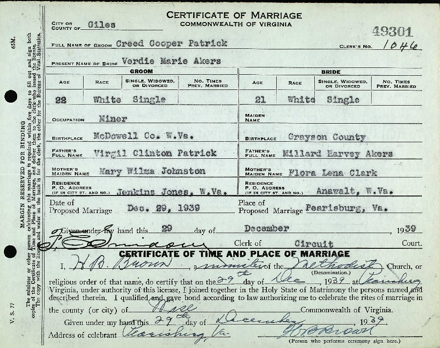 Married: Vertie Marie Akers December 29, 1939 in Pearisburg, Giles County, Virginia.