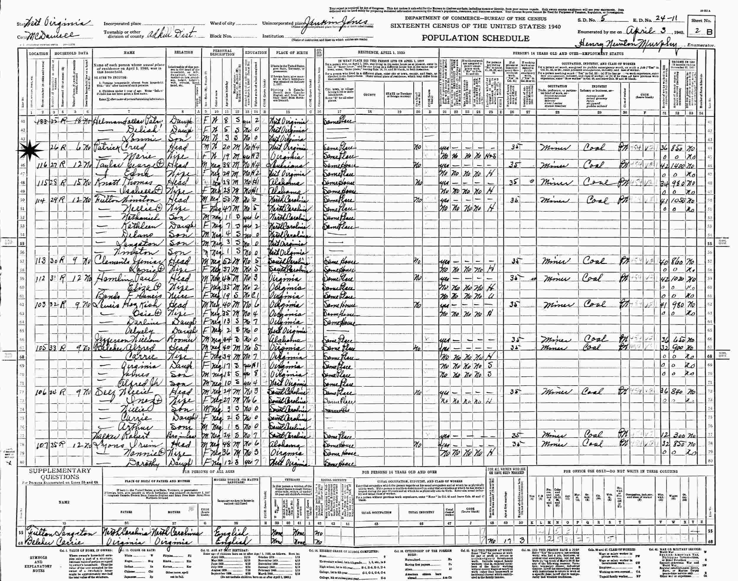 April 3, 1940 - Supervisor's District 5, Eumeration District 24-11, Jenkins-Jones, Adkin District, McDowell County, West Virginia.