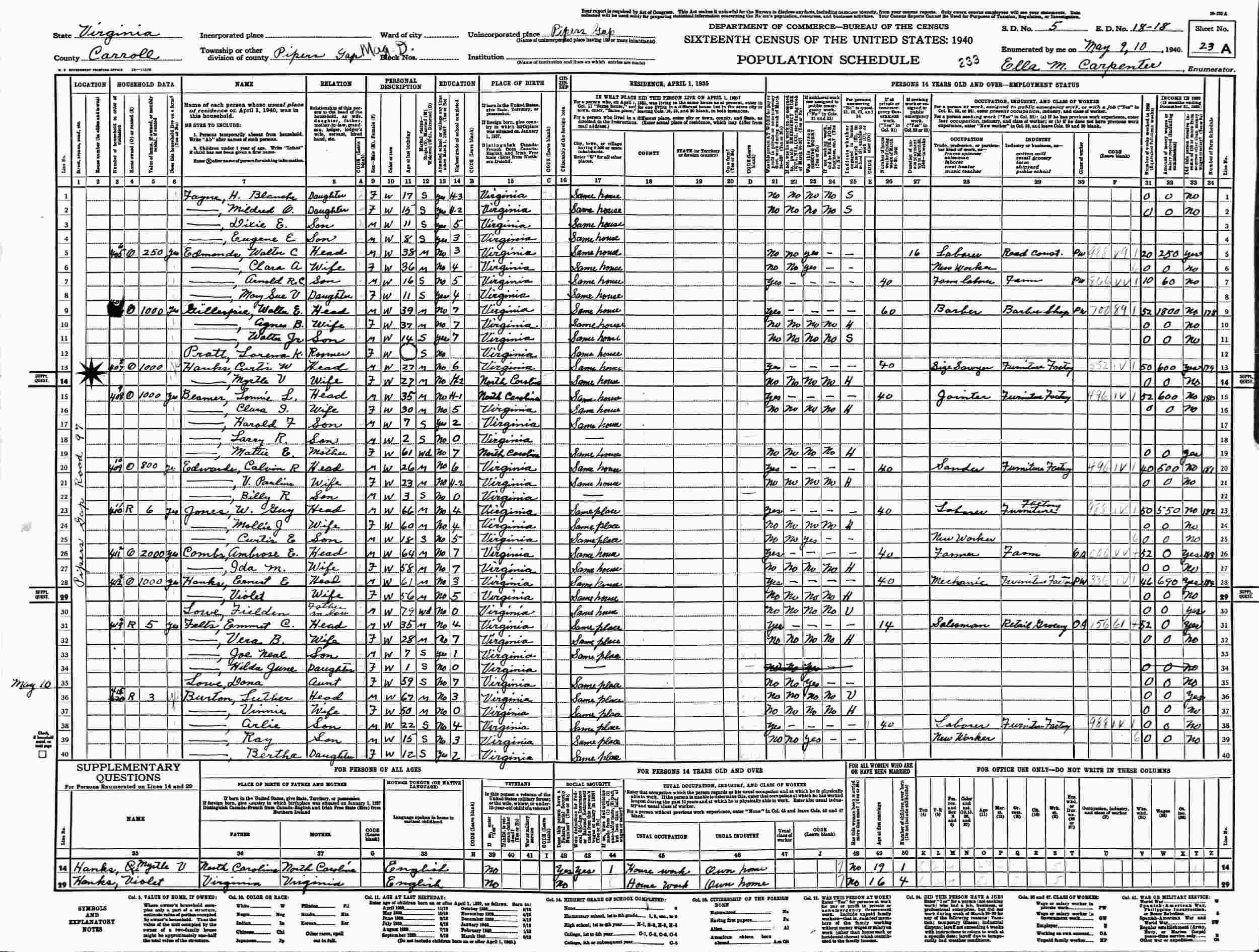 May 9-10, 1940 - Piper's Gap Road 97, Pipers Gap, Pipers Gap District, Supervisor's District 5, Enumeration District 18-18, Carroll County, Virginia.