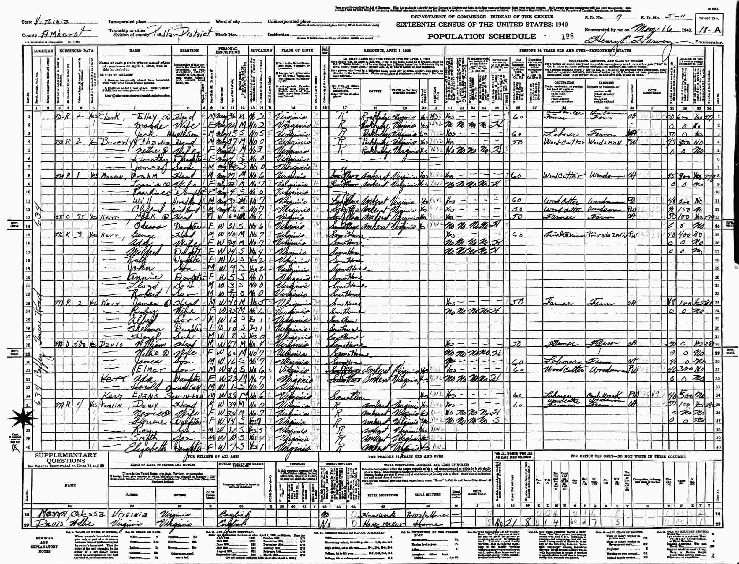 May 16, 1940 - Supervisor's District 7, Enumeration District 5-11, Pedlar Magisterial District, Amherst County, Virginia