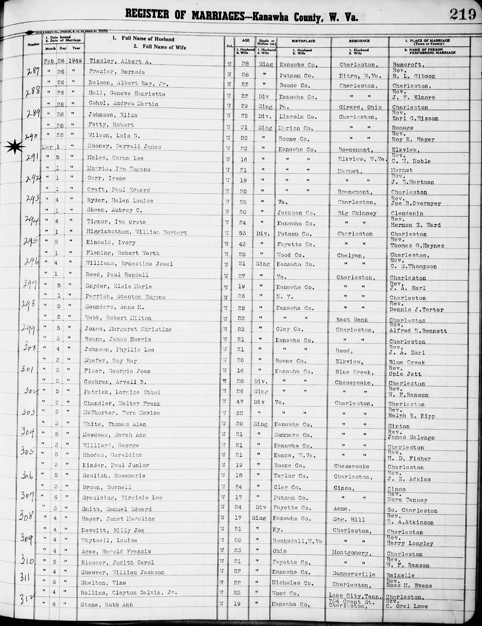 Married: Carma Lee Moles March 1, 1949 in Kanawha County, West Virginia.