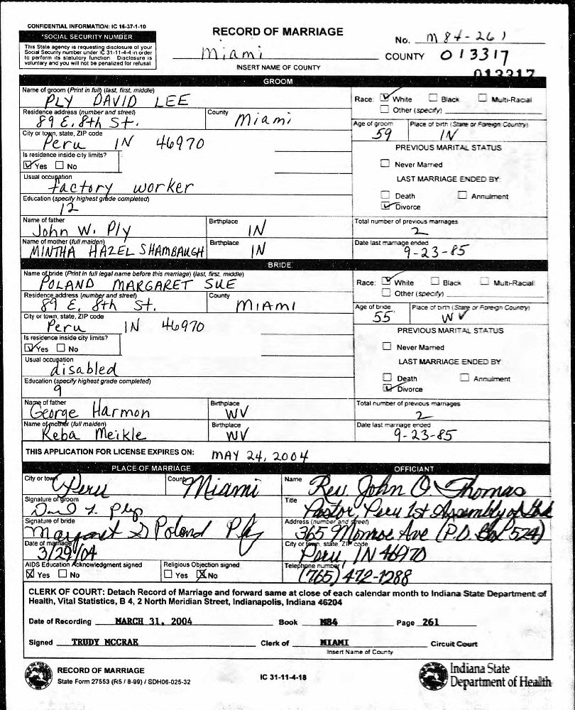 (2) Margaret Sue (nee Harmon) Poland March 26, 2004 in Peru, Miami County, Indiana.